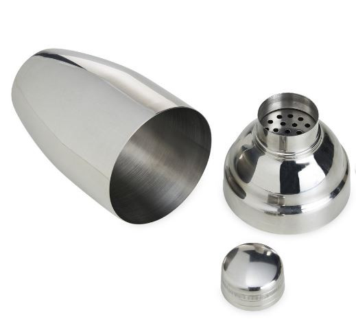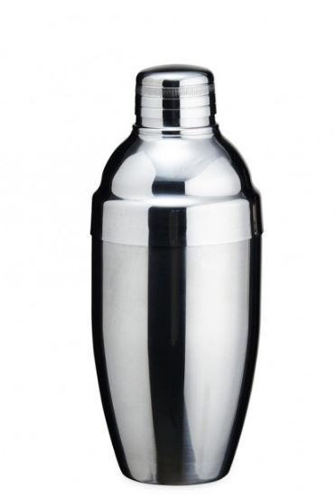 Coqueteleira de inox com capacidade para 600ml, contém tampa de pressão com peneira e tampa protetora.