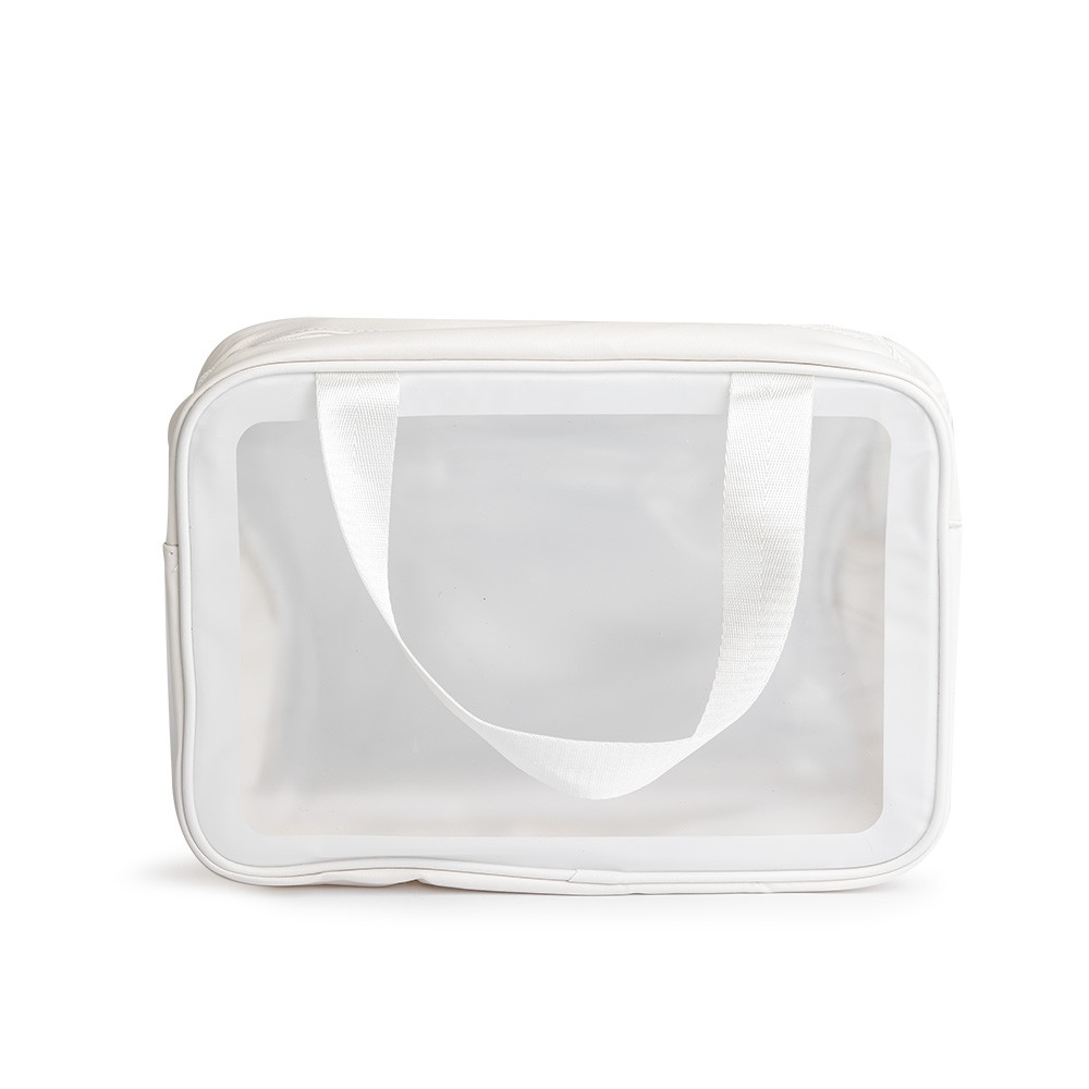Descrição: Nécessaire de PVC e PU com duas divisórias, uma delas em malha respirável, e duas alças laterais para facilitar o transporte.