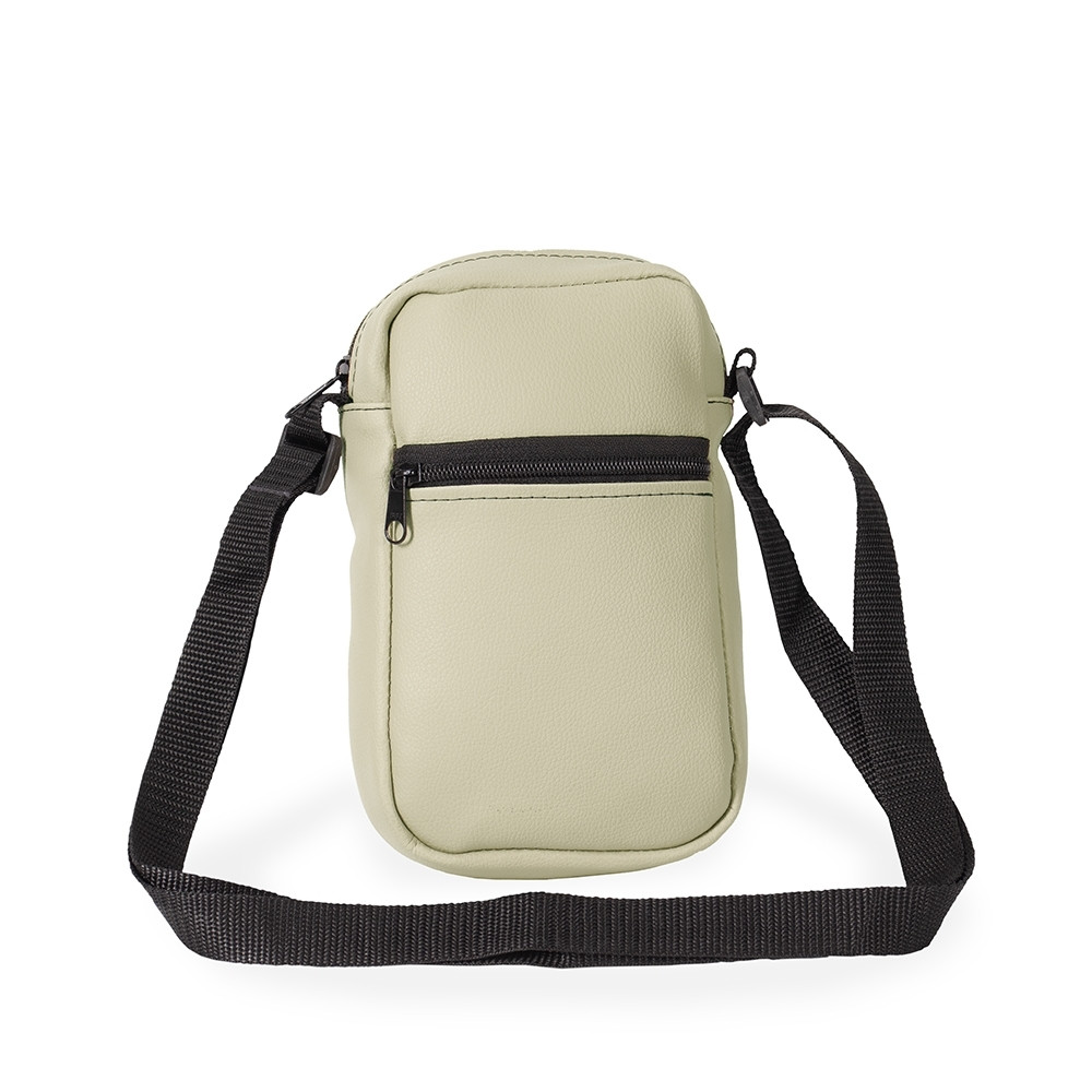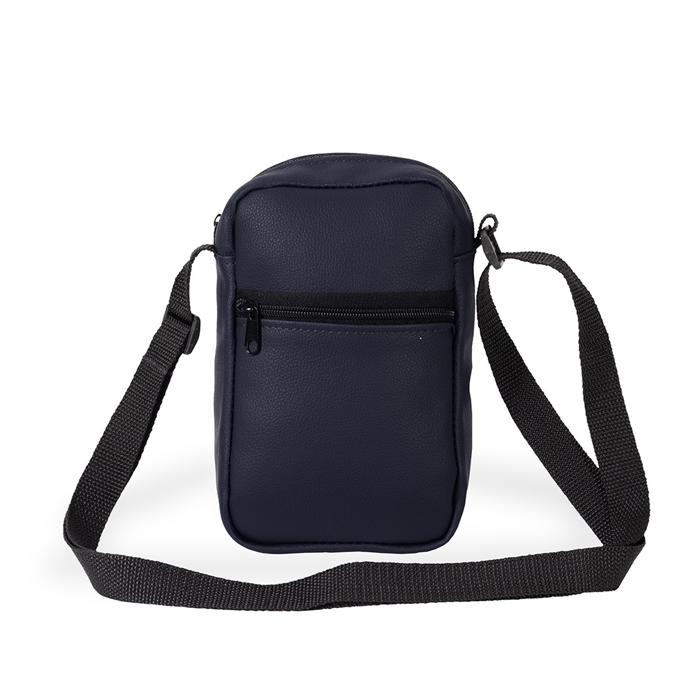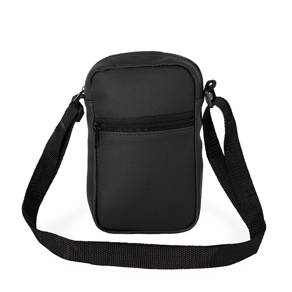 Bolsa de ombro confeccionada em couro sintético com fechamento em zíper e alça ajustável. Possui dois compartimentos: um com bolso aberto em tecido de malha e outro localizado na parte frontal.
