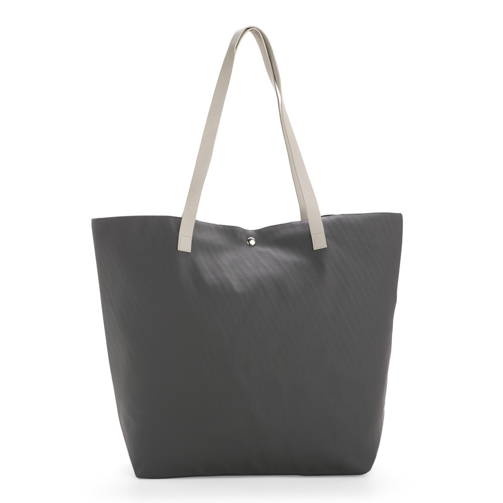 Sacola confeccionada em couro sintético à base de PVC com par de alças de costura externa e botões magnéticos metálicos para fechamento. Possui revestimento interno em poliéster e bolso compacto com fechamento em zíper.