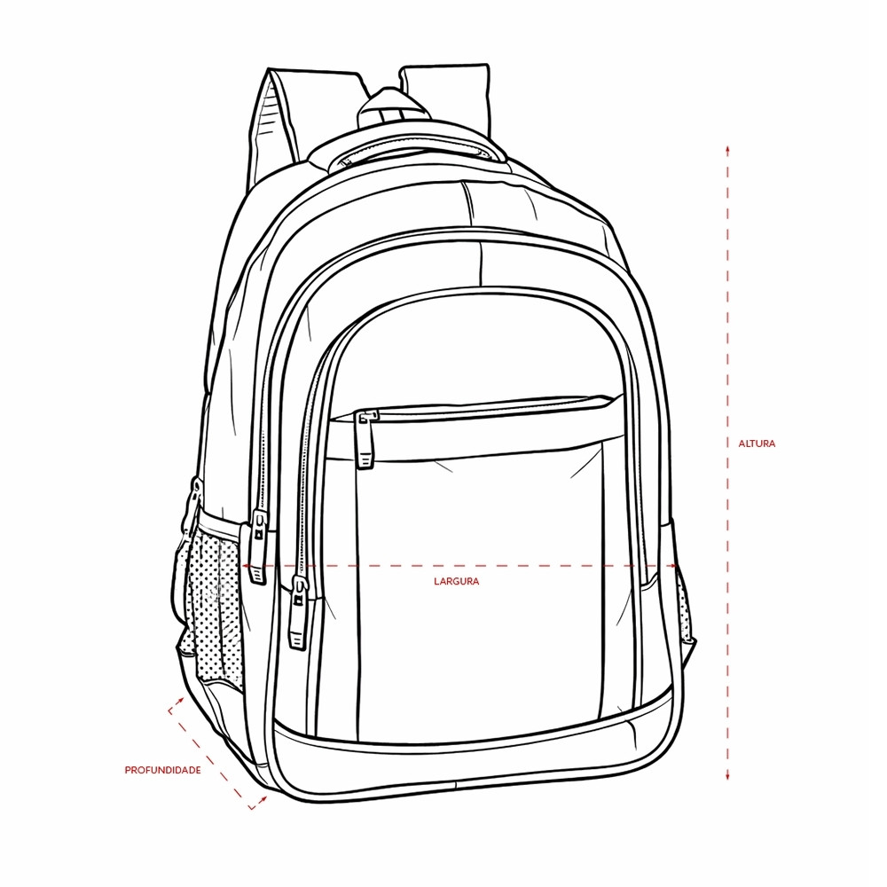 Mochila confeccionada em poliéster 900D impermeável, com fechamento em zíper e capacidade para até 32 litros. Possui compartimento interno com divisória para notebooks de até 17,3 polegadas. Conta ainda com três compartimentos frontais em tamanhos diferentes e dois bolsos laterais em malha com elástico, além de revestimento em tecido respirável na parte posterior, nas alças para as costas e na alça de mão.