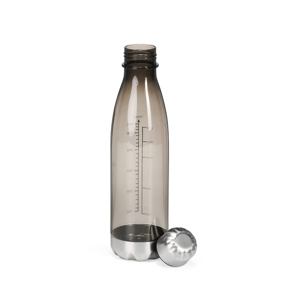 Garrafa plástica translúcida com capacidade máxima de 750ml e marcação de volume até 700ml. Conta ainda com base e tampa rosqueável em alumínio.