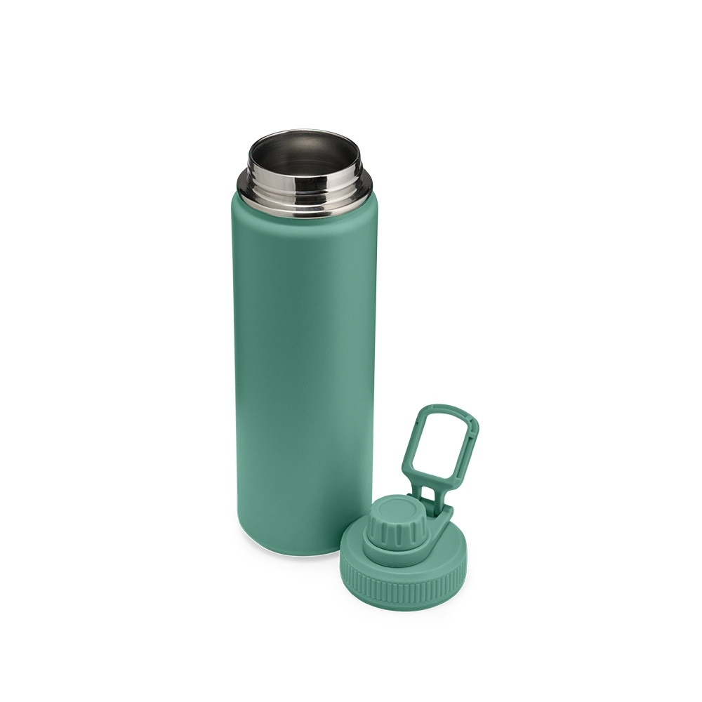 Garrafa térmica feita em inox com pintura eletrostática e capacidade de até 750ml. Possui estrutura em parede dupla e isolamento a vácuo, o que permite manter a temperatura de líquidos conservada por mais tempo. Conta ainda com tampa rosqueável em plástico, protetor para o bocal e alça retangular para transporte.