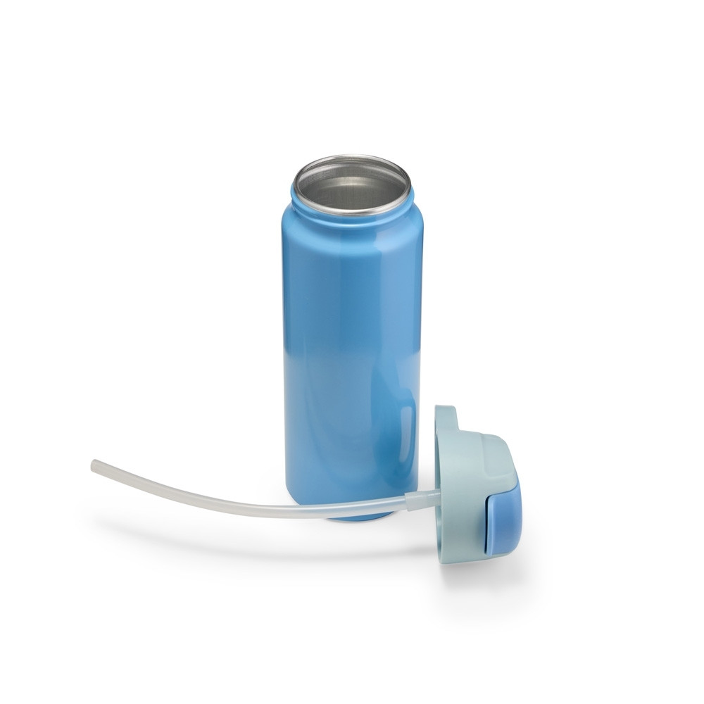 Squeeze de alumínio com capacidade máxima de 600ml. Possui tampa rosqueável em plástico com alça para transporte, protetor de bocal, bico flip top e canudo interno em plástico.