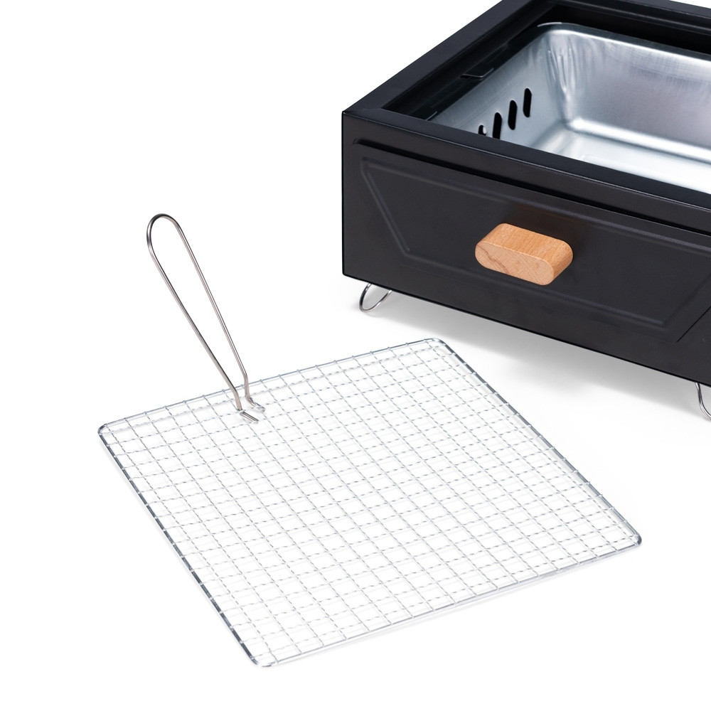 Churrasqueira portátil em ferro com pés retráteis em metal. Conta com grelha e bandeja para carvão em metal com puxador de madeira.