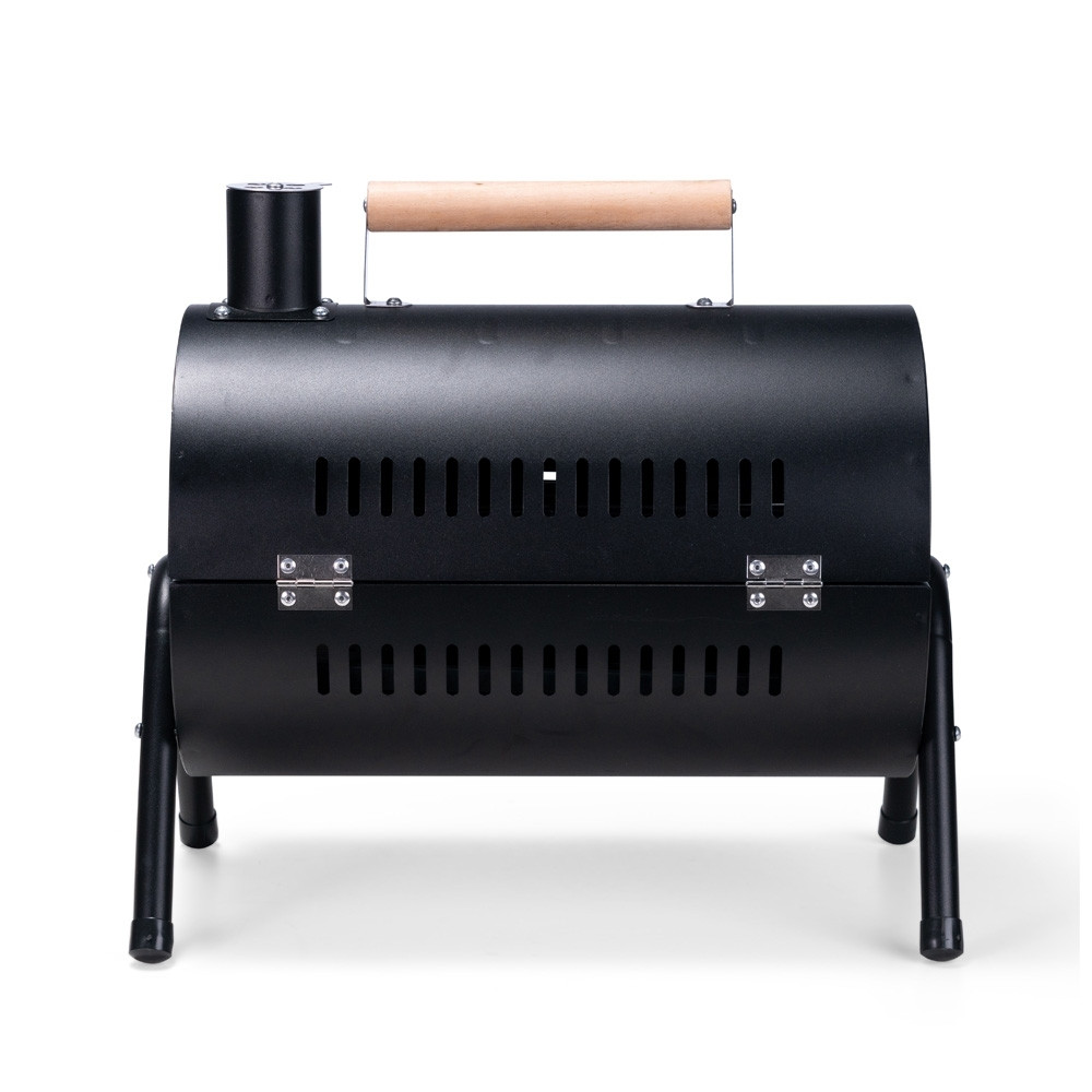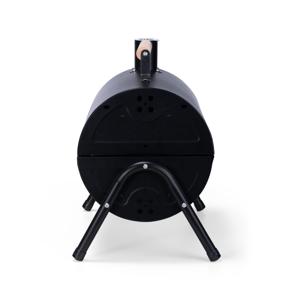 Churrasqueira portátil de formato cilíndrico com estrutura em ferro que permite o uso em duas faces ao mesmo tempo. Possui cabo em madeira de faia, chaminé com regulador, protetor emborrachado para os pés e trava de segurança. Acompanha duas grelhas e duas placas para encaixe interno galvanizado.